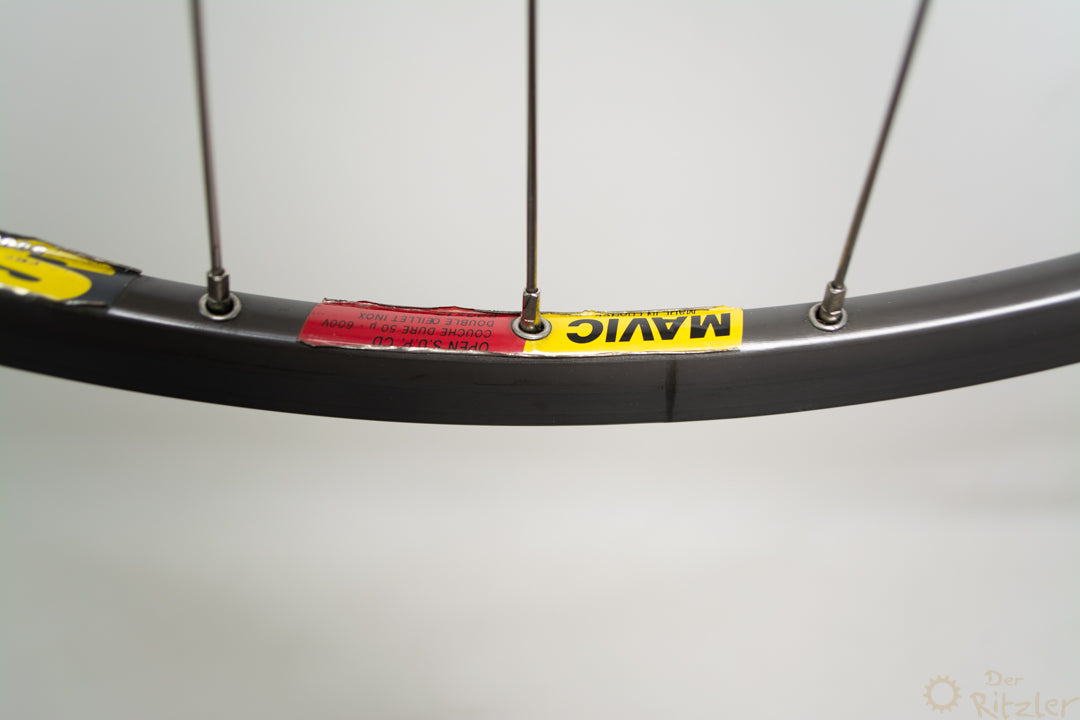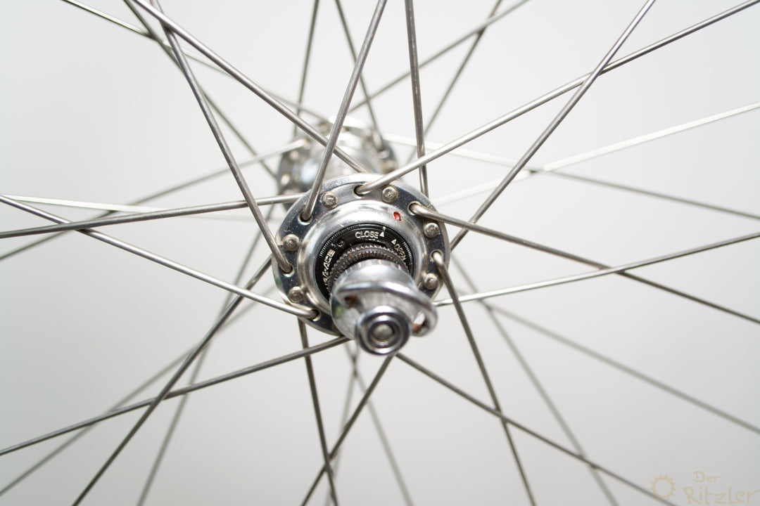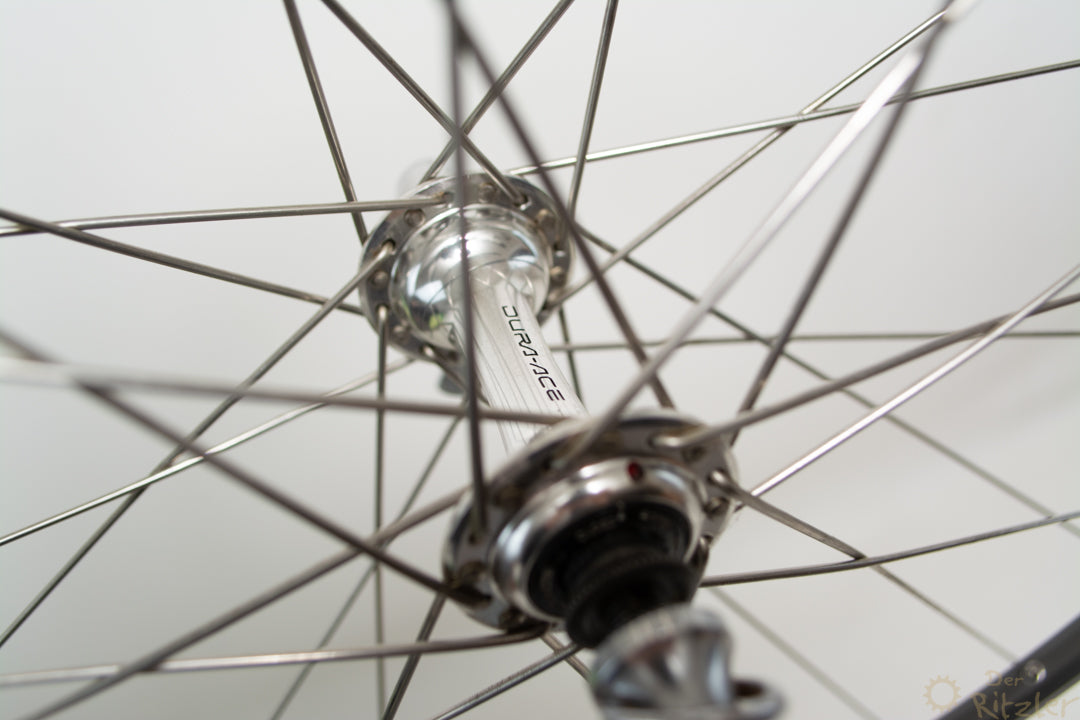 Nabe: Shimano Dura Ace Felge: Mavic Open SUP CDEinbaubreite: 100 mmFelgenschulterdurchmesser: 622 mmInnenmaulweite: 13 mmReifen: Clincher