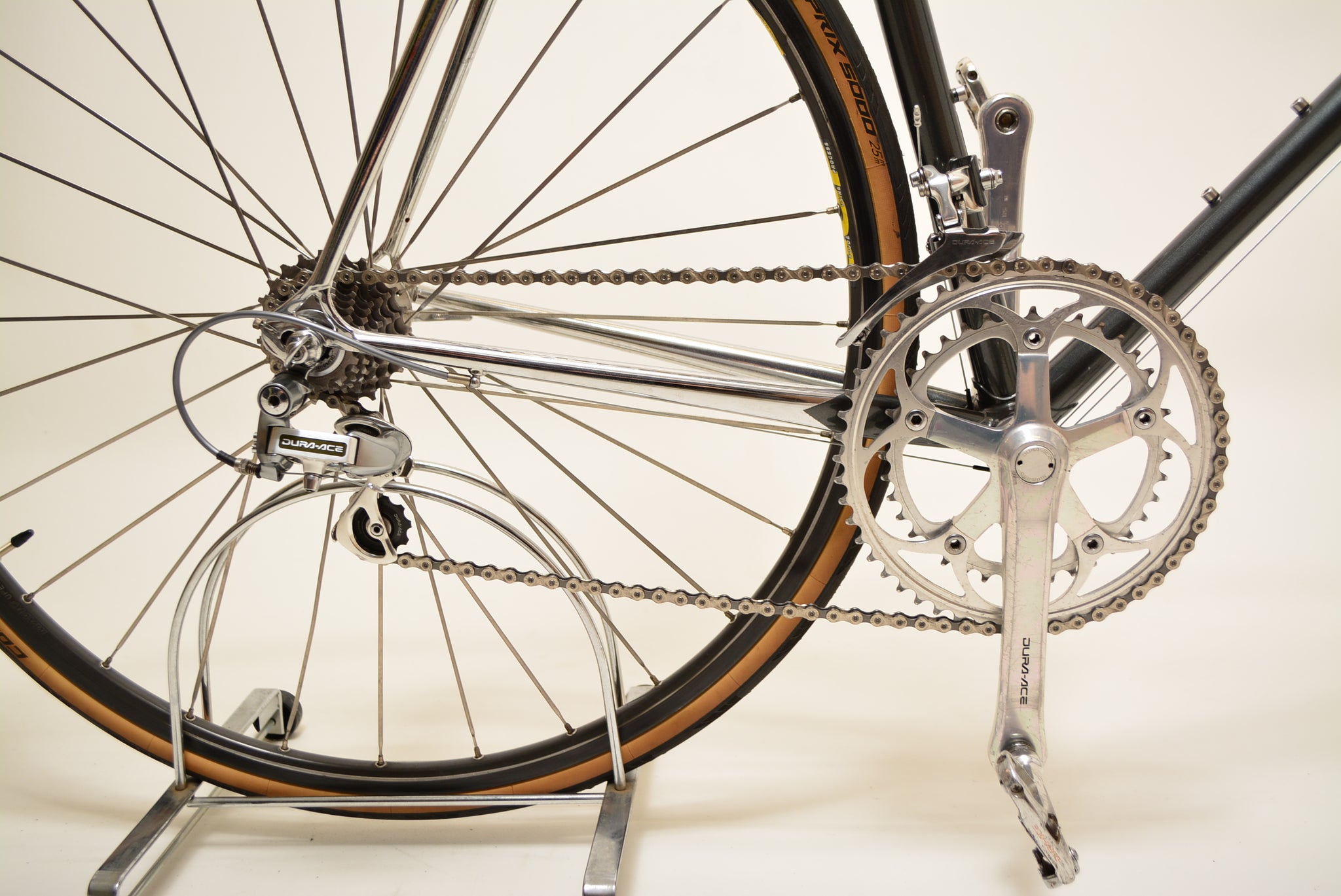 Technisch ist das Rad kompromisslos ausgestattet: komplette Shimano Dura-Ace Gruppe (2x8-fach) – darunter Kurbelgarnitur (53/39), Schaltwerk, Umwerfer, Bremsen, Schalthebel und Innenlager. Für exzellente Laufruhe sorgen Mavic 571 Naben mit Mavic Ceramic Felgen, bestückt mit Continental Grand Prix 5000 Reifen in 25 mm Breite – schnell, griffig und modern.
