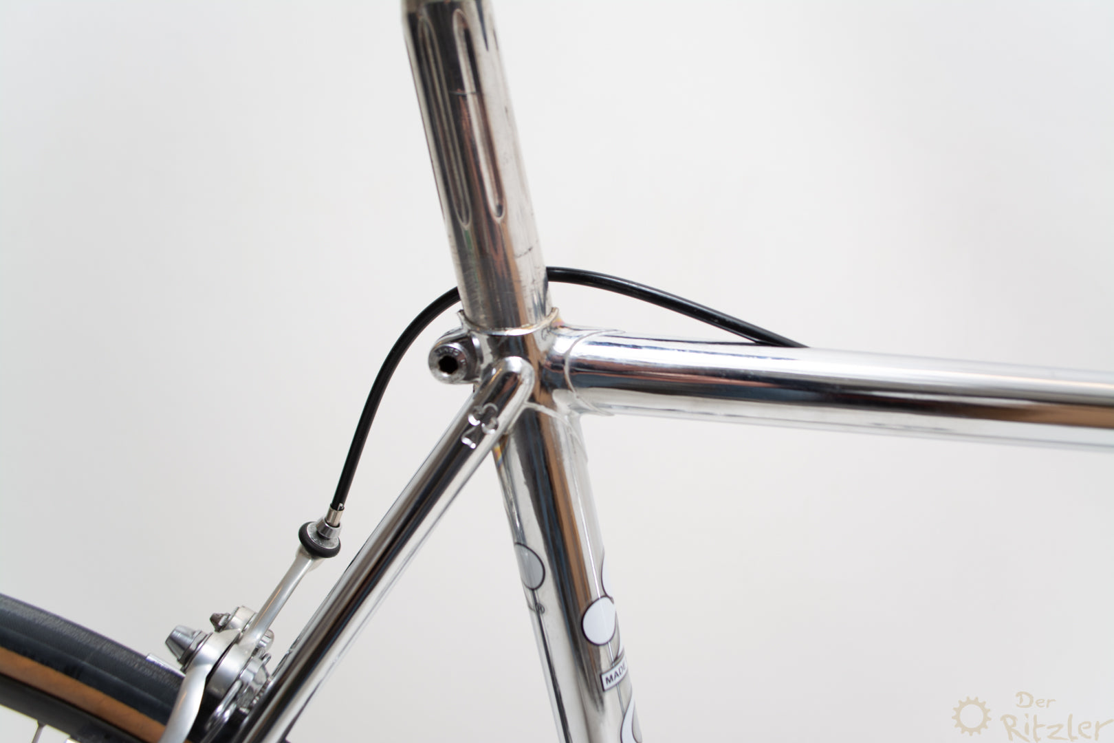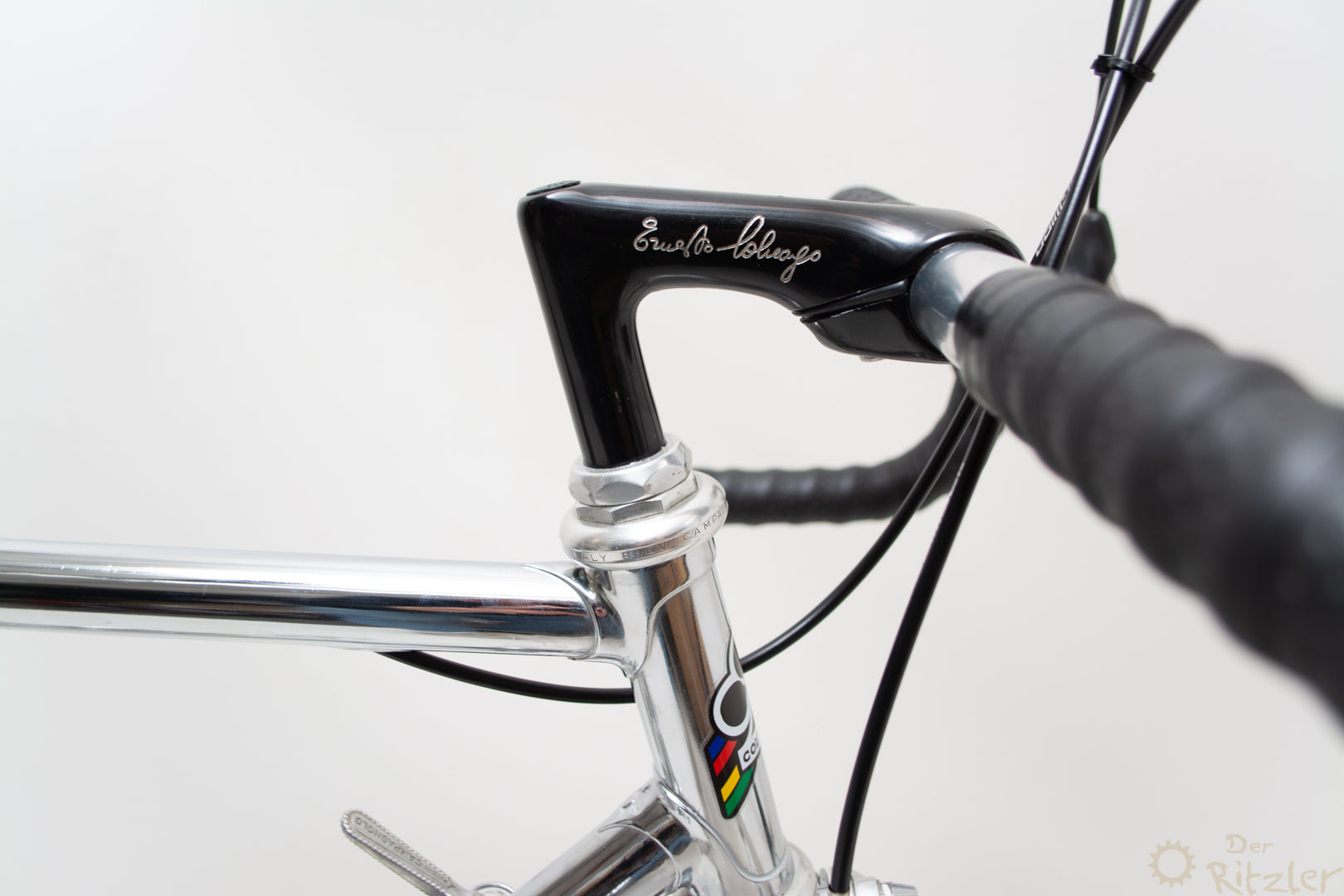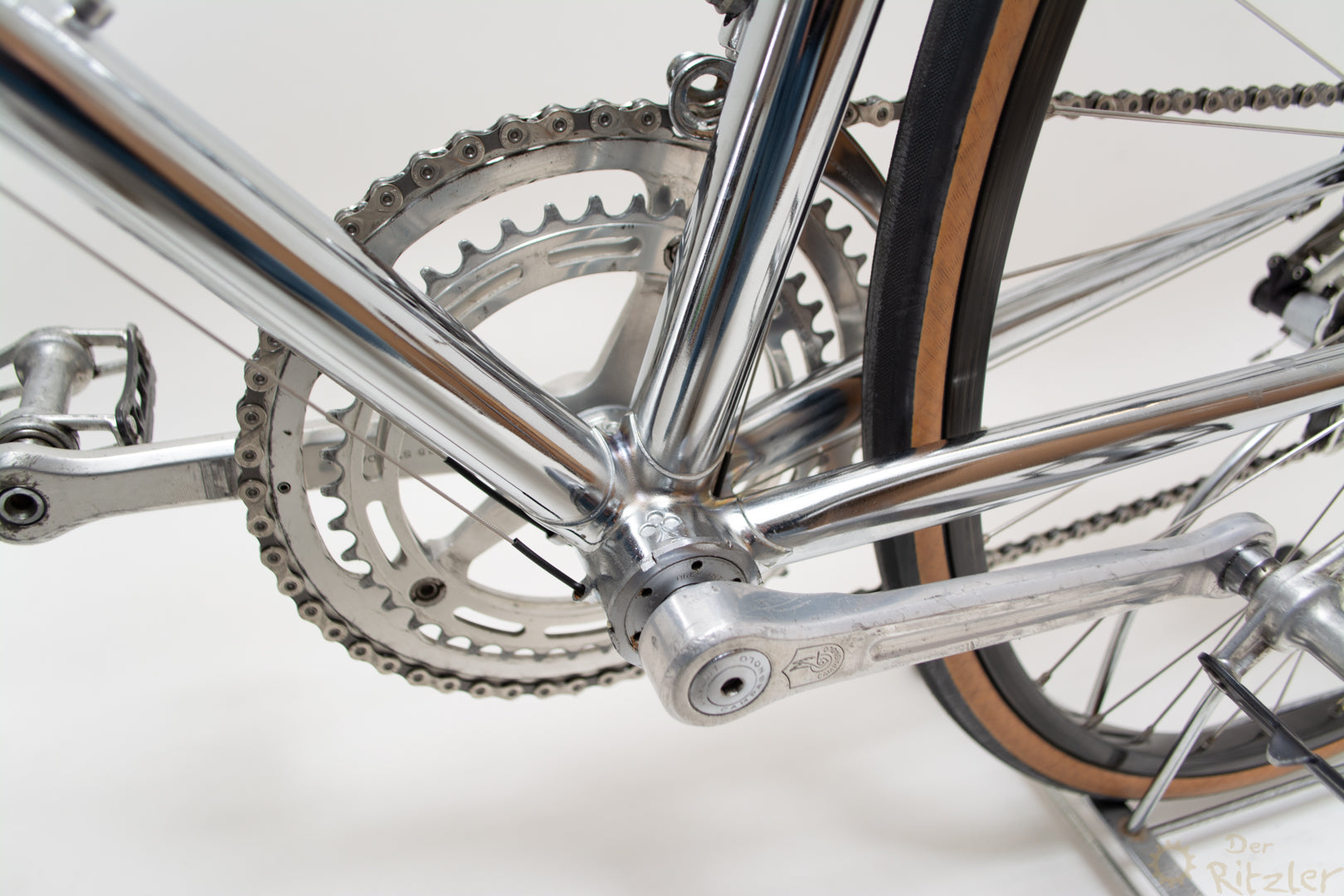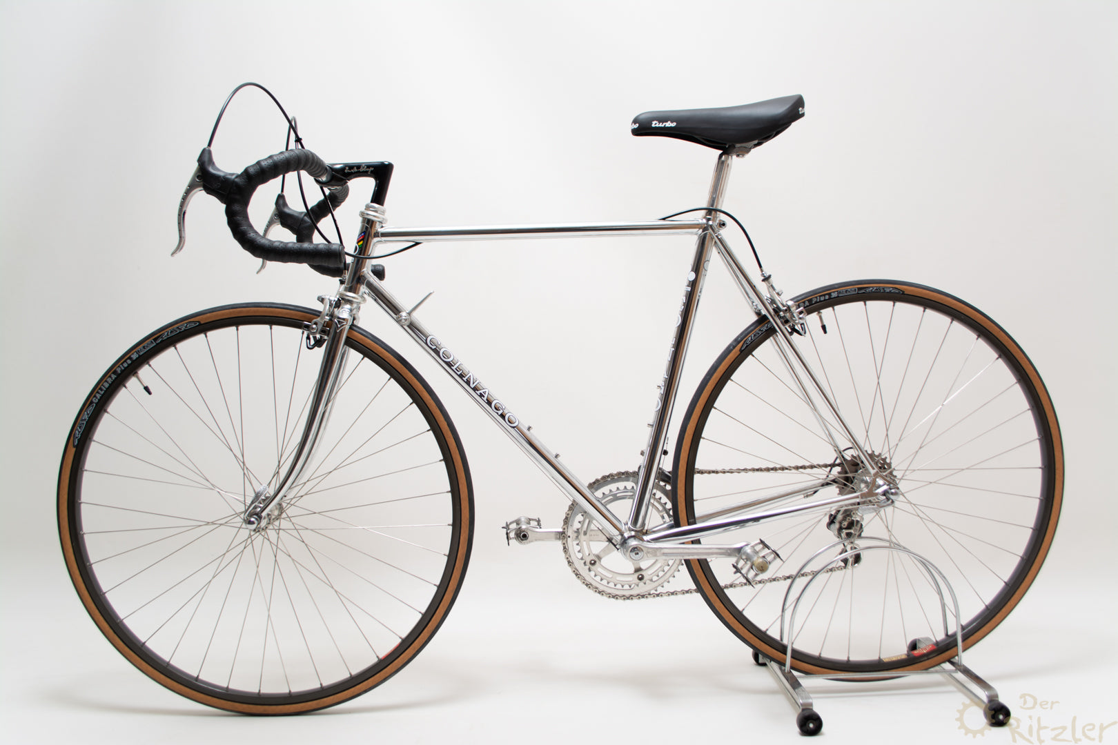 Das Colnago Super Pui' ist ein klassischer Stahlrahmen aus der goldenen Ära des italienischen Rennradbaus, der nachträglich komplett verchromt wurde. Die Basis bildet ein originaler Colnago Super Rahmen, wie er in den 1980er Jahren gebaut wurde – bekannt für sein präzises Fahrverhalten, geringes Gewicht und die typische Colnago-Rahmengeometrie. Die Verchromung wurde fachgerecht durchgeführt und verleiht dem Rad eine markante, spiegelnde Optik, die sich von der Masse abhebt und dennoch stilvoll klassisch bleibt.