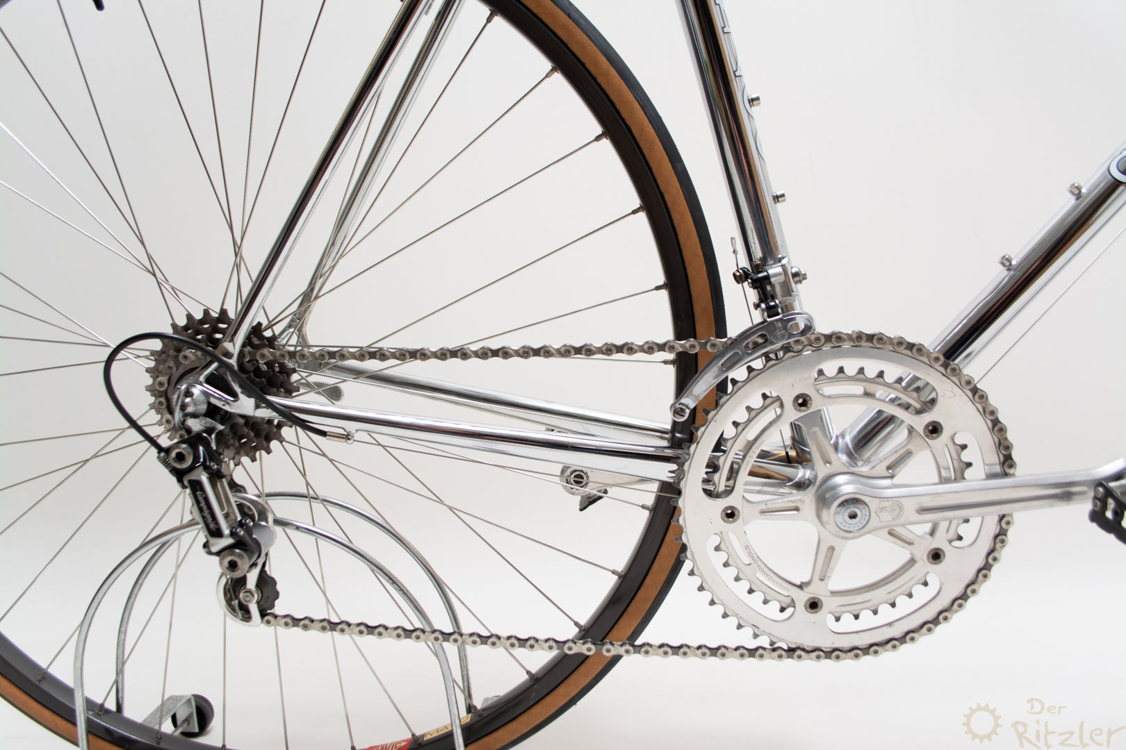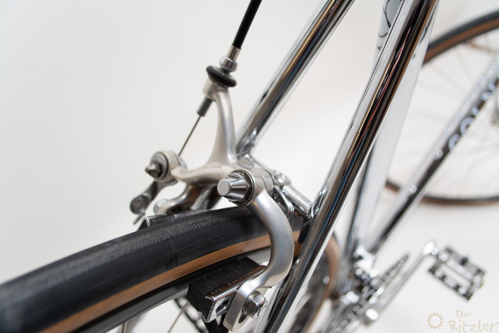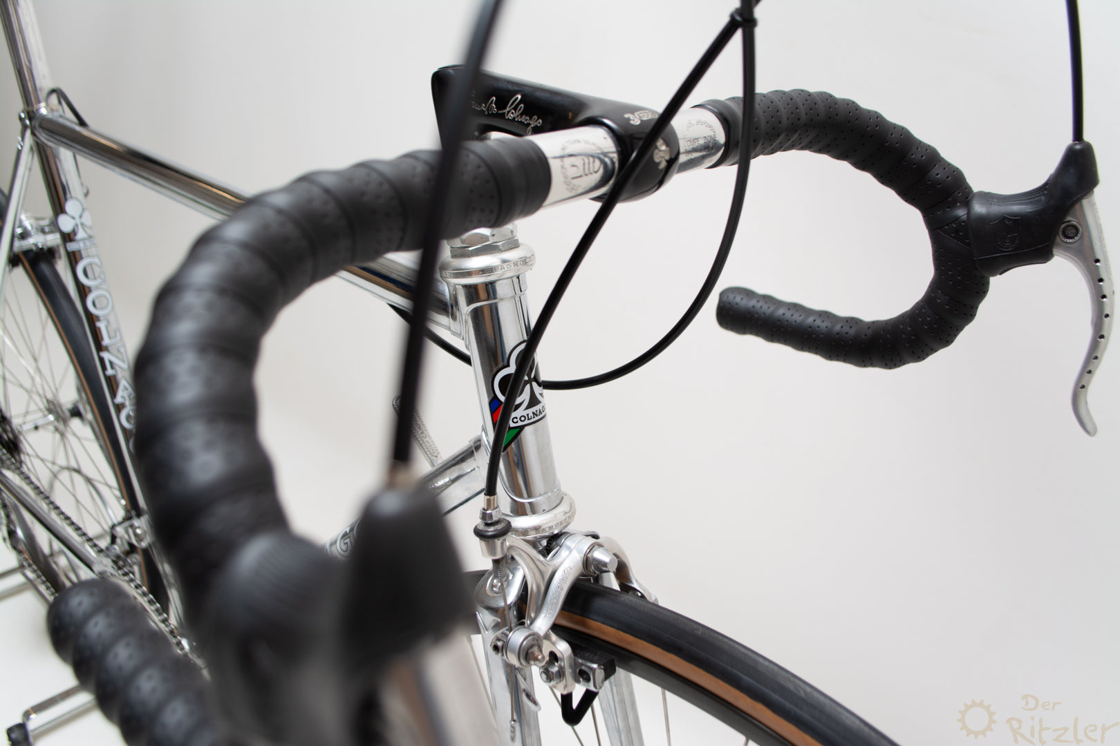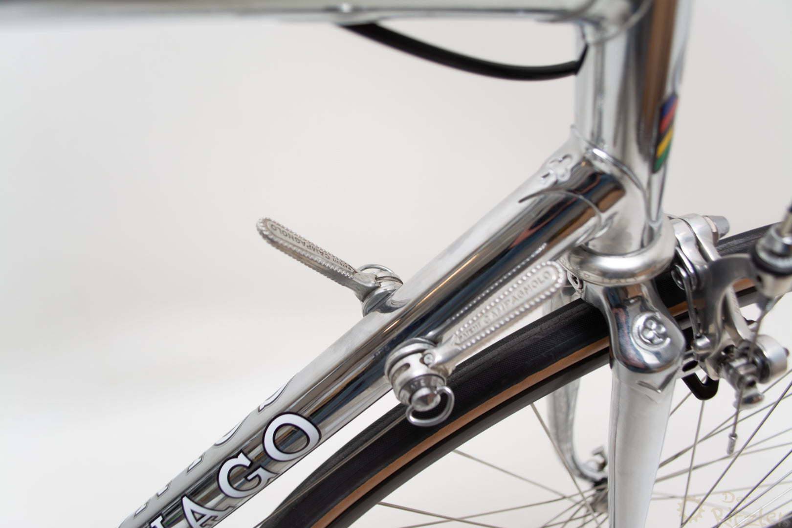 Das Colnago Super Pui' ist ein klassischer Stahlrahmen aus der goldenen Ära des italienischen Rennradbaus, der nachträglich komplett verchromt wurde. Die Basis bildet ein originaler Colnago Super Rahmen, wie er in den 1980er Jahren gebaut wurde – bekannt für sein präzises Fahrverhalten, geringes Gewicht und die typische Colnago-Rahmengeometrie. Die Verchromung wurde fachgerecht durchgeführt und verleiht dem Rad eine markante, spiegelnde Optik, die sich von der Masse abhebt und dennoch stilvoll klassisch bleibt.